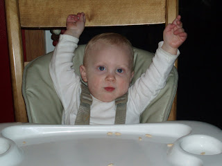 Alex wouldn't be a Kearney boy if he weren't getting into some kind of trouble. In the first picture he got a hold of D.J.'s "Sport Illustrated" one day and decided to leaf through it while Julie was getting ready for work. The second picture shows Alex's favorite activity, pulling all of the Tupperware and utensils out of the drawers. One day he completely emptied the two bottom drawers. The only reason he didn't do three was because he couldn't reach.